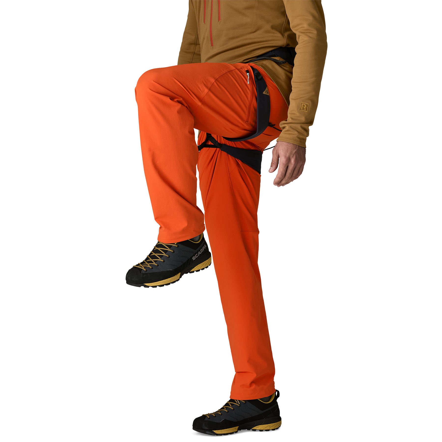 Weather-resistant, durable 92% recycled nylon/8% spandex double weave with a durable water repellent (DWR) finish made without intentionally added PFAS and a brushed interior for comfort - Built for All-Day Comfort in a Harness